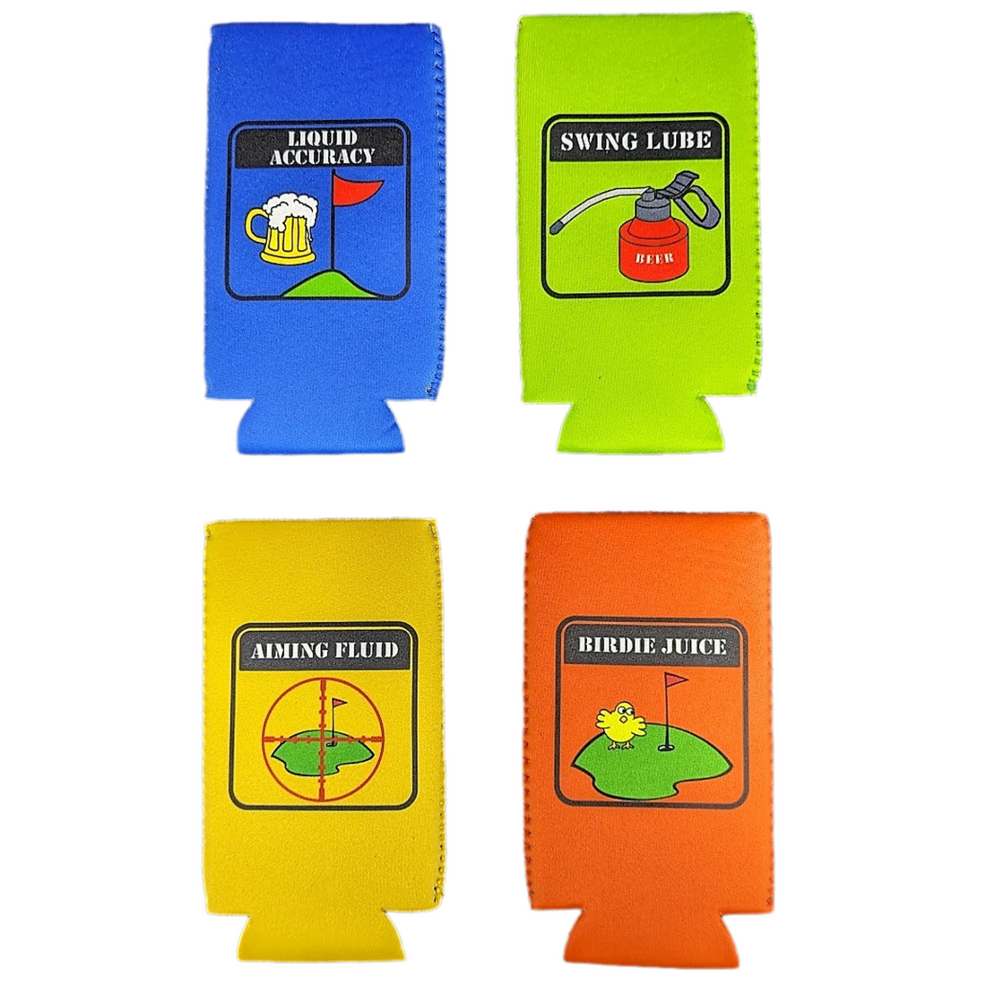 Golfer Theme | ' Birdie Juice ' Aiming Fluid ' Liquid Accuracy ' Swing Lube - Can Cooler Sleeve Set of 4 (one of each)